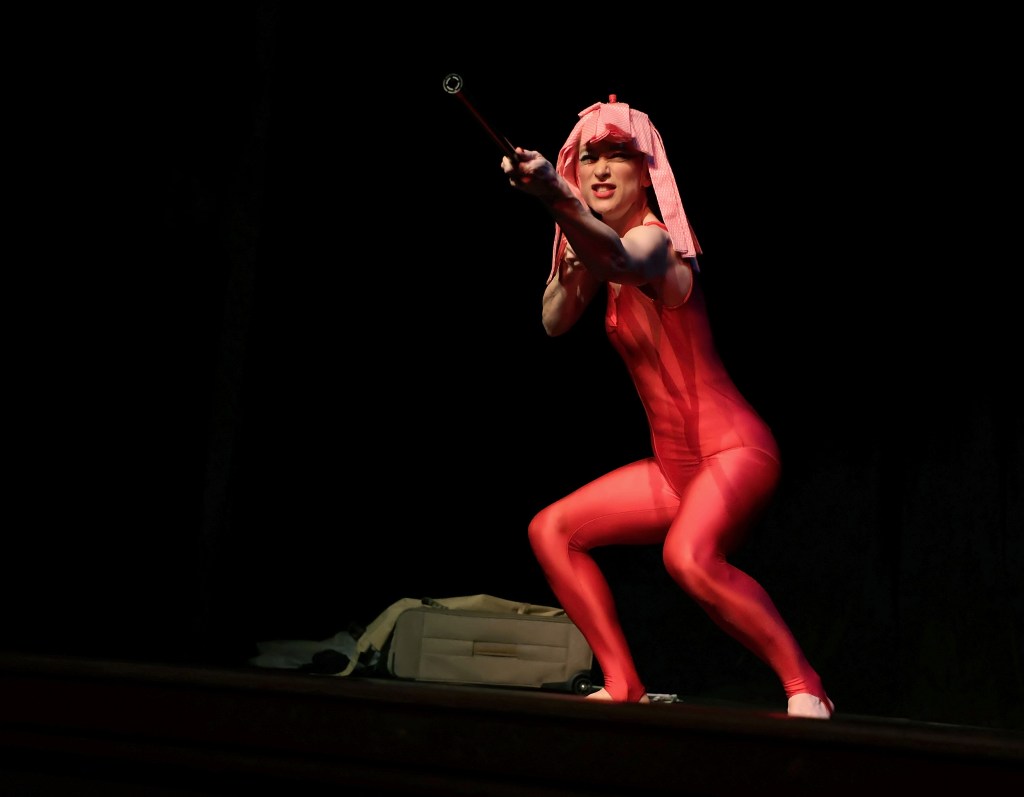 Brining energy and bravery to her show, she throws herself into wacky costumes, including a feathered headdress and a cleaners outfit. The entertainer cartwheels across the stage in a shiny red unitard, performing crazy interpretive dance moves, much to the joy of the crowd.