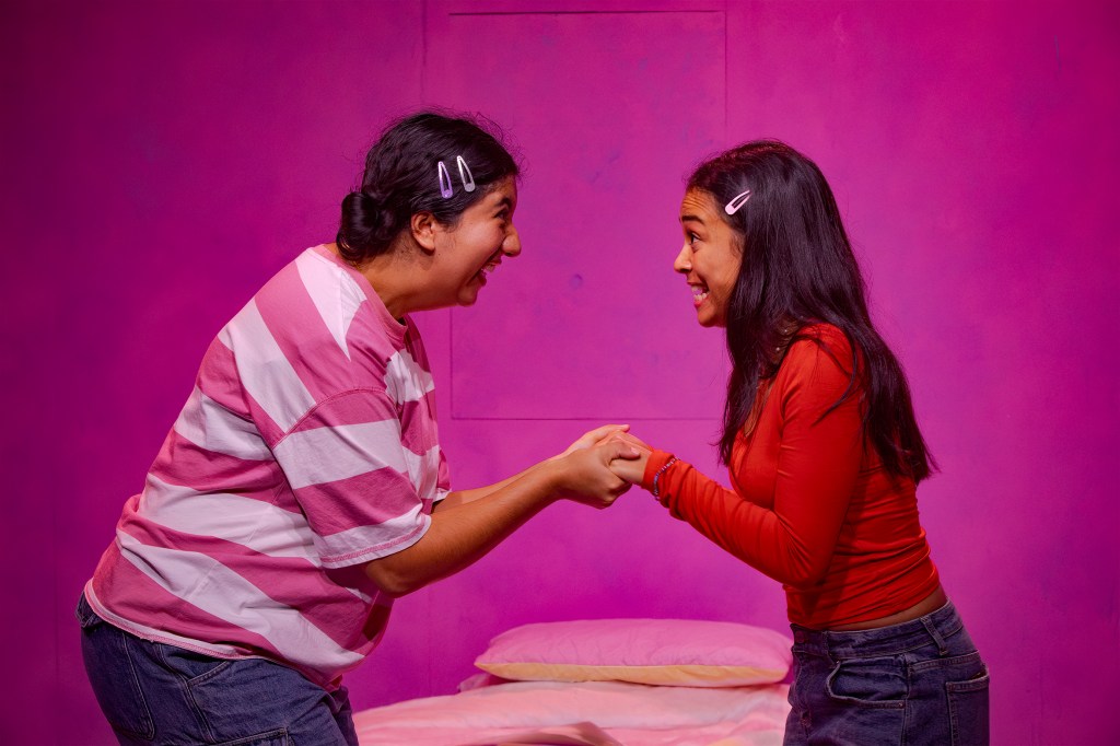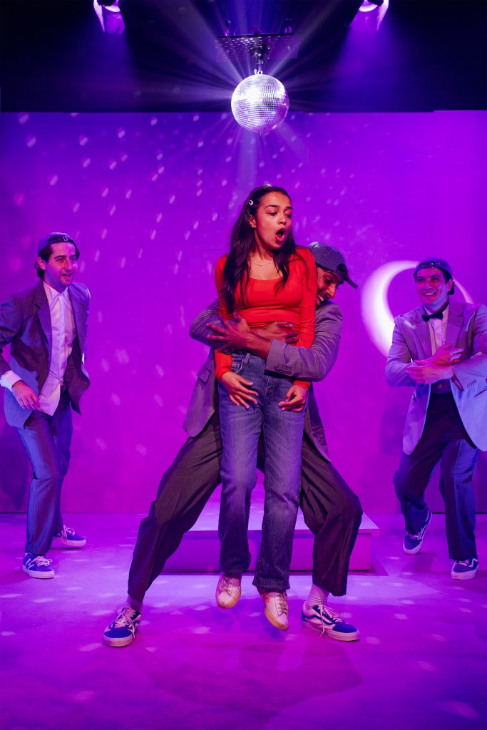 Hailley Hunt’s set design is brilliant, with constantly evolving the staging and clever carpentery touches that seamlessly create new scenes. A mirror ball drops from the celing, transforming Amber’s bedroom into a dance floor. Panels in the stage walls fold down or open up to reveal a kabab shop, a rooftop, a priest’s confessional, and even a Robert Pattinson poster. Isabel Morrissey’s lighting design further enhances each transition, adding emotional depth with colour.