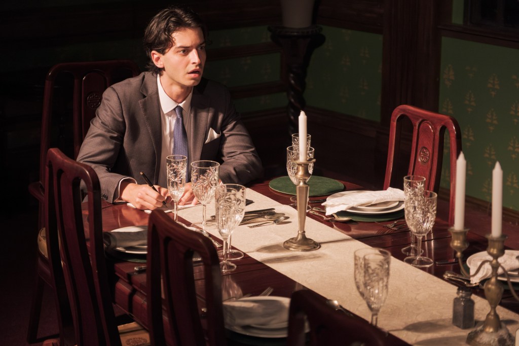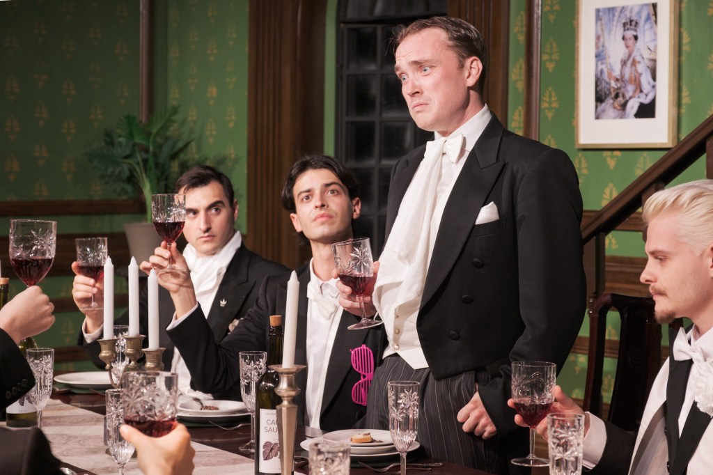While often disturbing, POSH is also sharply funny with a witty script, punchy delivery and bold direction by Margaret Thanos (Furious Mattress). The pomp and ceremony interjected into the club’s rituals add layers of absurdity. The protocol calls for games, dancing, poetry, and singing. With every toast, the men imbibe, and the dinner gets more out of hand. The revelry turns to hazing, with one of the club members (Dylan O’Connor as Toby) forced to drown wine glass after wine glass which members have added questionable substances to including salt, spit, and worse.