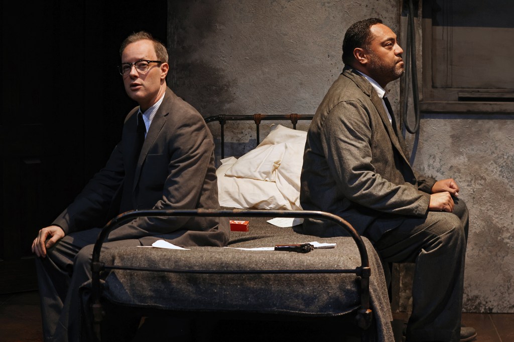 In The Dumb Waiter we see Davies return, this time in the role of Ben, joined by Anthony Taufa as his sidekick Gus. The pair play hitmen holed up in a former basement kitchen, awaiting their next assignment. As mysterious food orders arrive through a serving hatch, tension builds and their anxiety escalates. This second play leans into dark comedy, laced with a vaudevillian flair, as the two bicker and unravel in the claustrophobic space.