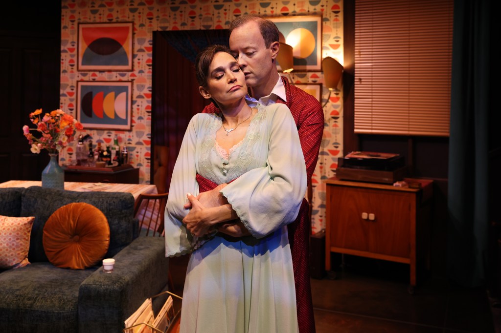 As is typical for Pinter, characters dominate and in The Lover Davies is captivating, seamlessly shifting between the reserved husband and the debonair lover, drawing frequent laughter from the audience. Their interactions are a mix of flirtation, role-play, and wit — starkly contrasted with the rigid façade of their 1950s domestic life, where Sarah dutifully greets Richard with a glass of whisky.