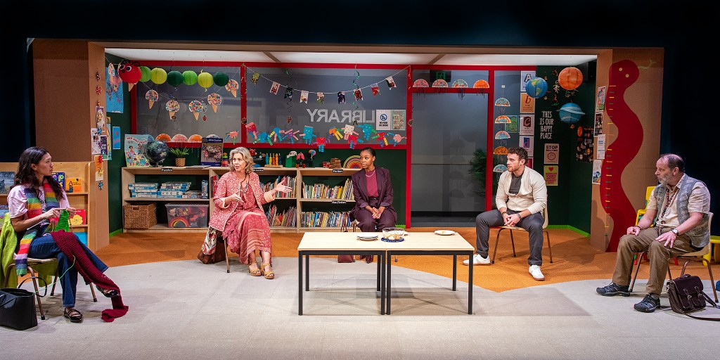 A sign on the wall glows ‘this is our happy place’, ironically undercutting the chaos. Kate Beere’s vibrant set and costume design evokes a cheerful primary school library, complete with an entire section of the library dedicated to books on social justice, making it clear Eureka Day is no ordinary institution.