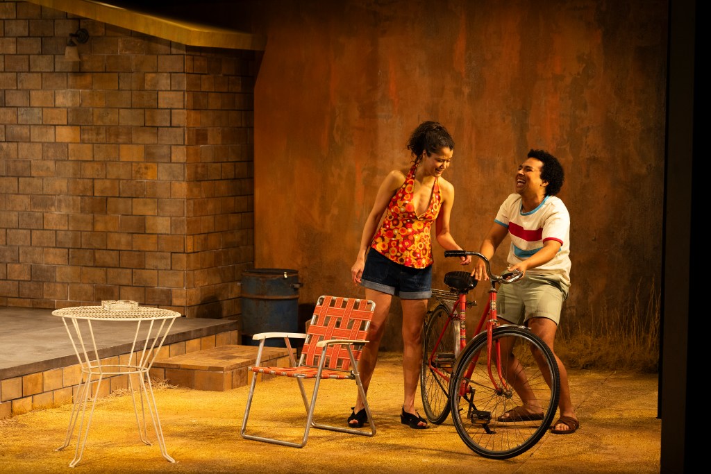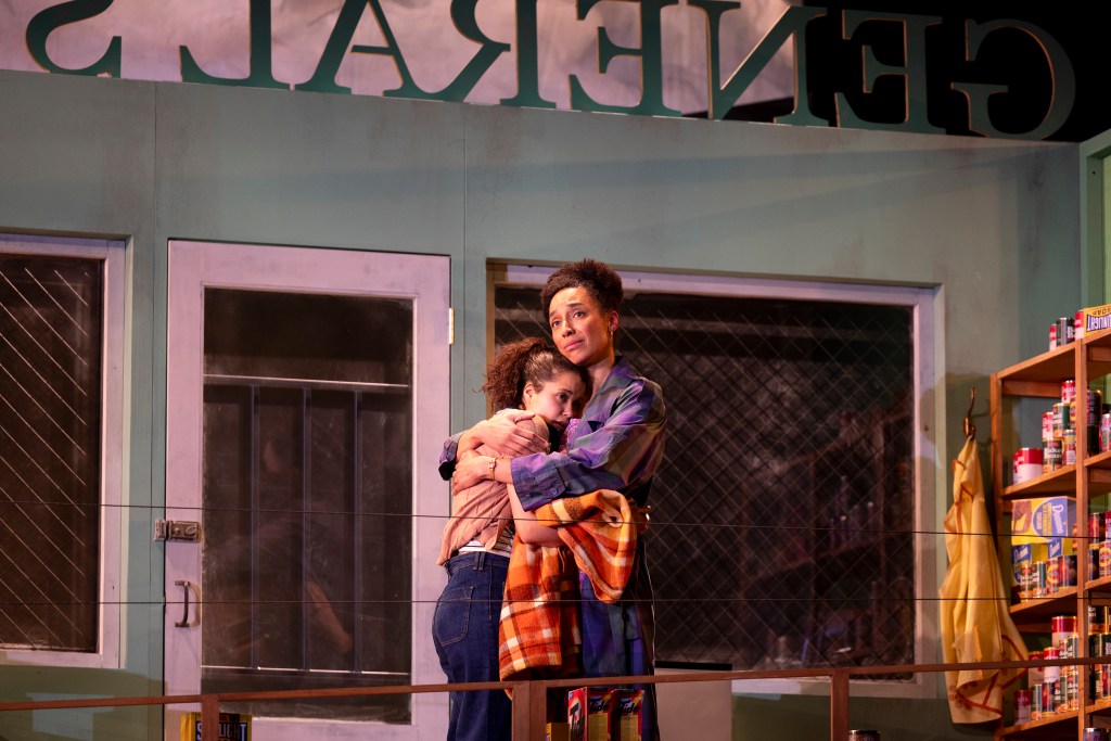 With no intermission or scene changes, Sophie Woodward’s two-story set gives the characters room to dance and run. The tripartite structure creates height and depth, adding realism. Downstairs the family’s spacious home, upstairs the general store where Della works. High above, the sky shifts from bright blue to menacing clouds, echoing the play’s mood. The yellow-walled home is bright and cheerful, in sharp contrast to the stark, dangerous world outside.