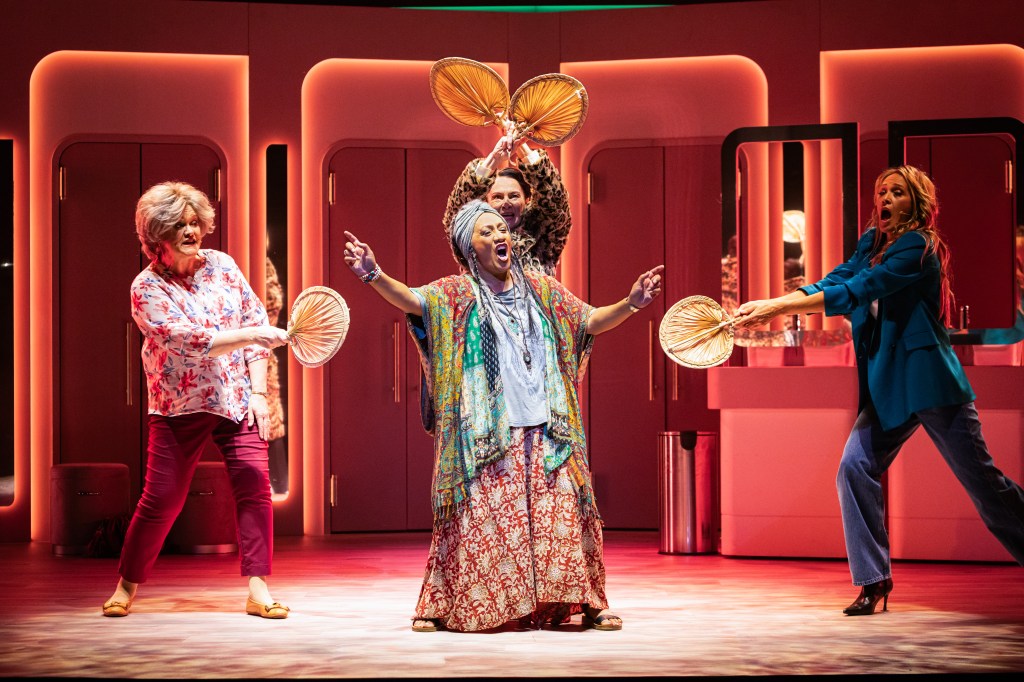 The action unfolds in a ladies’ department store, but the vibe is closer to a rock-pop concert complete with fluorescent strobe lighting. Set design by Frances Story cleverly positions the band above the stage and transforms dressing rooms into toilet stalls for dramatic entrances. Christine Mutton’s costumes add to the fun, shifting from black sparkly dresses to cheeky moments in pyjamas and slippers.