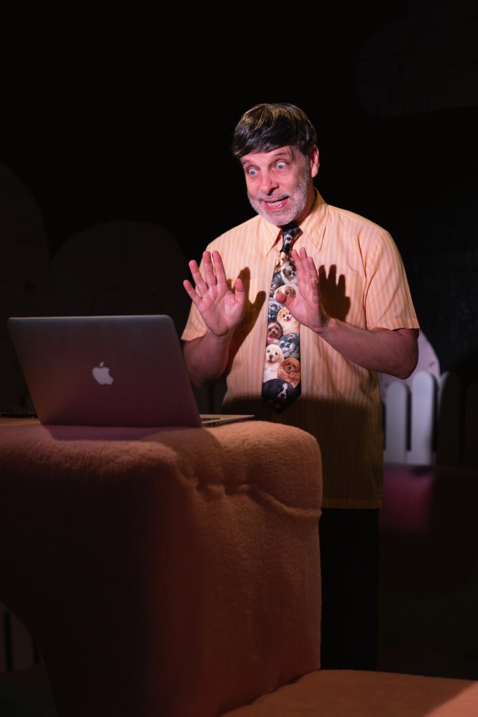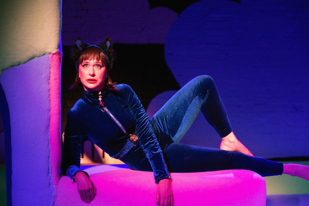 Zintra, the Burmese Blue with her strong European accent, delivers a harsh judgement of new owner Lisa Wilson—mocking her and attacking her at night, convinced that this terminally single middle-aged overweight woman is not worthy of a cat of such pedigree. The playwrights lean into stereotypes, but it’s a hilarious skit, and Bishop perfectly captures the feline persona with dramatic death drops and micro-naps.