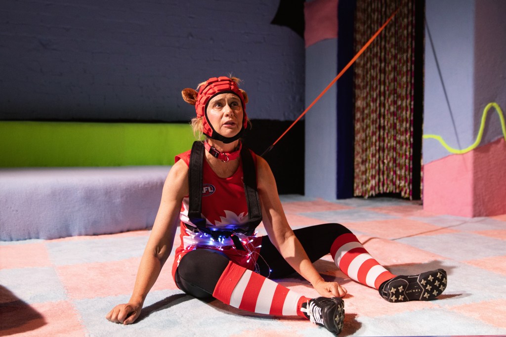 Kate Beere’s vibrant set design is reminiscent of Play School with pink, green and purple tones, a pet playground and colourful flooring. There are few props, save for a bag that captivates the cat’s attention, but projections and diagrams cleverly illustrate the olfactory superiority of animals. Costume design is a highlight, especially the blue velvet catsuit complete with bell, and a walking stick marking the older age of a floppy-eared, thirteen-year-old Labrador.