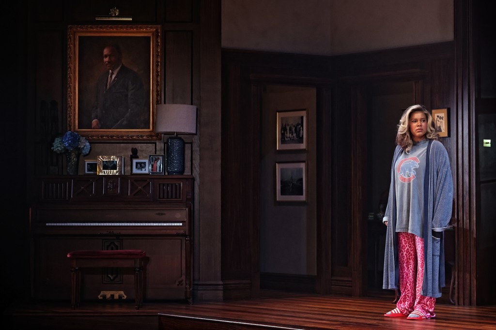 With snow falling outside, designer Jeremy Allen uses depth and space to create a richly detailed set: tiered floors, a staircase, and an inset dining room, are adorned with a large portrait of Martin Luther King Jr., family photographs and African artworks. The walnut wood-panelled walls and polished interiors speak to the family’s quiet wealth.